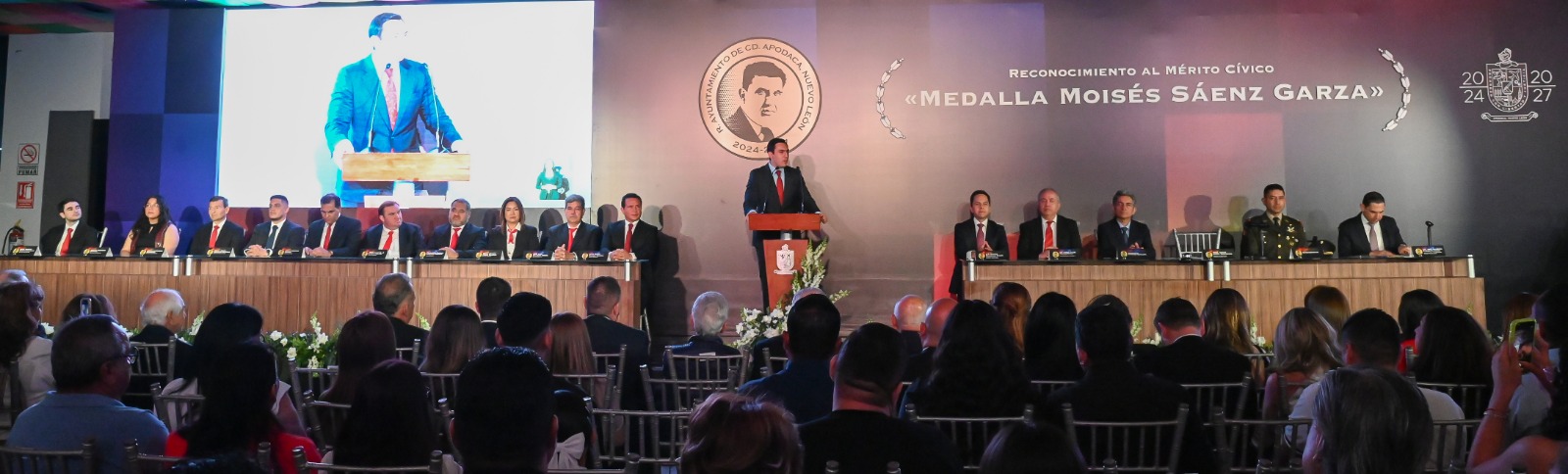 En Mesa de Honor estuvieron presentes el diputado local Héctor Morales Rivera, en representación del H. Congreso del Estado de Nuevo León; el Dr. Juan Paura García, Secretario de Educación de Nuevo León, en representación del Gobierno del Estado; el Mayor de Infantería Fabián González Córdoba, representante de la Séptima Zona Militar; los Secretarios que conforman la Administración Municipal, así como los miembros del Honorable Cabildo, entre otros funcionarios públicos. En la ceremonia también estuvieron presentes el diputado federal Andrés Cantú; las diputadas locales Gabriela Govea y Elsa Escobedo; así como exalcaldes de la ciudad, líderes de la comunidad apodaquense, y ciudadanos en general.